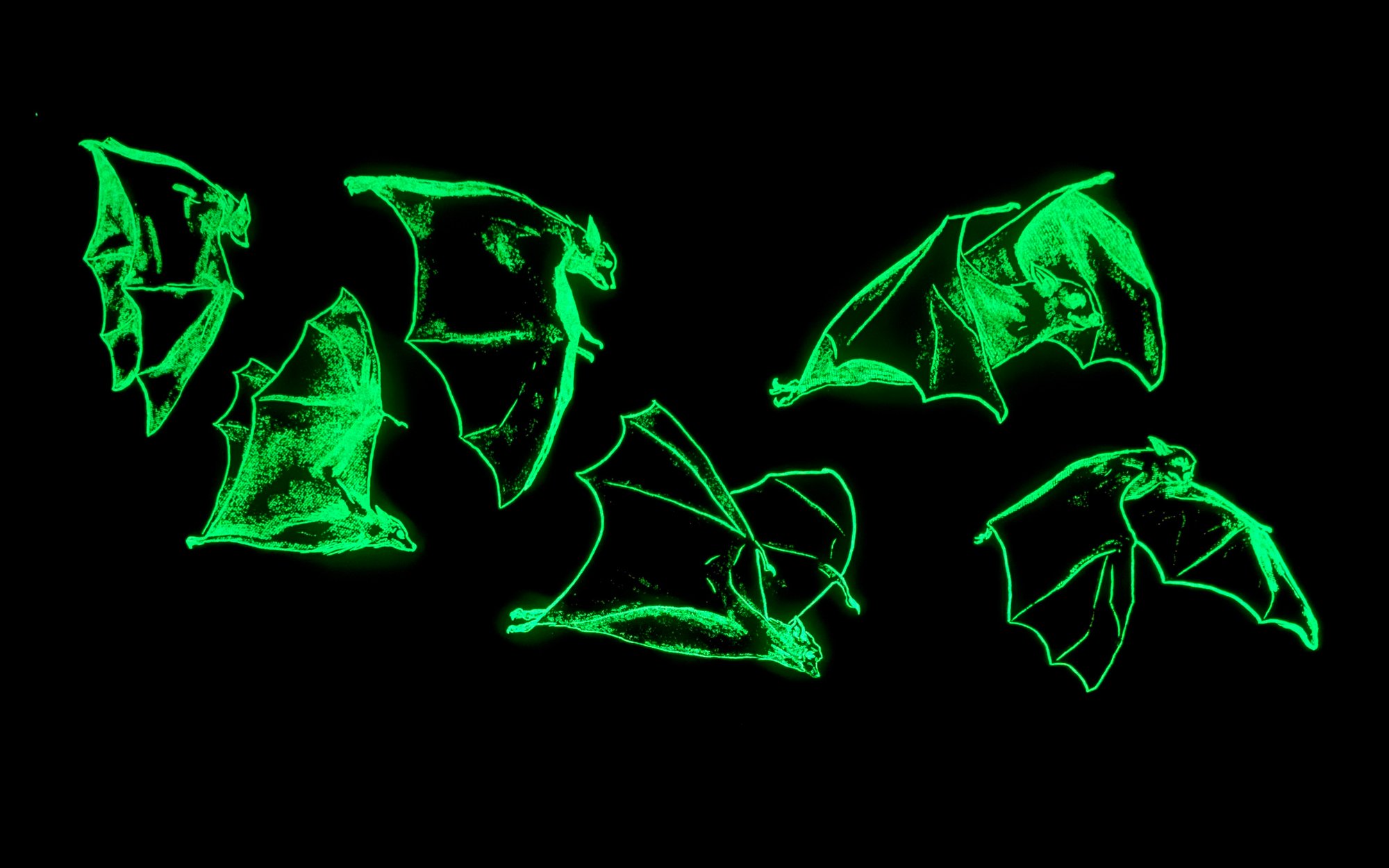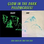 This pillowcase has an image of bats flying printed in green ink on one side and blue on the other. It is hand-printed, machine washable, and will glow for hours.