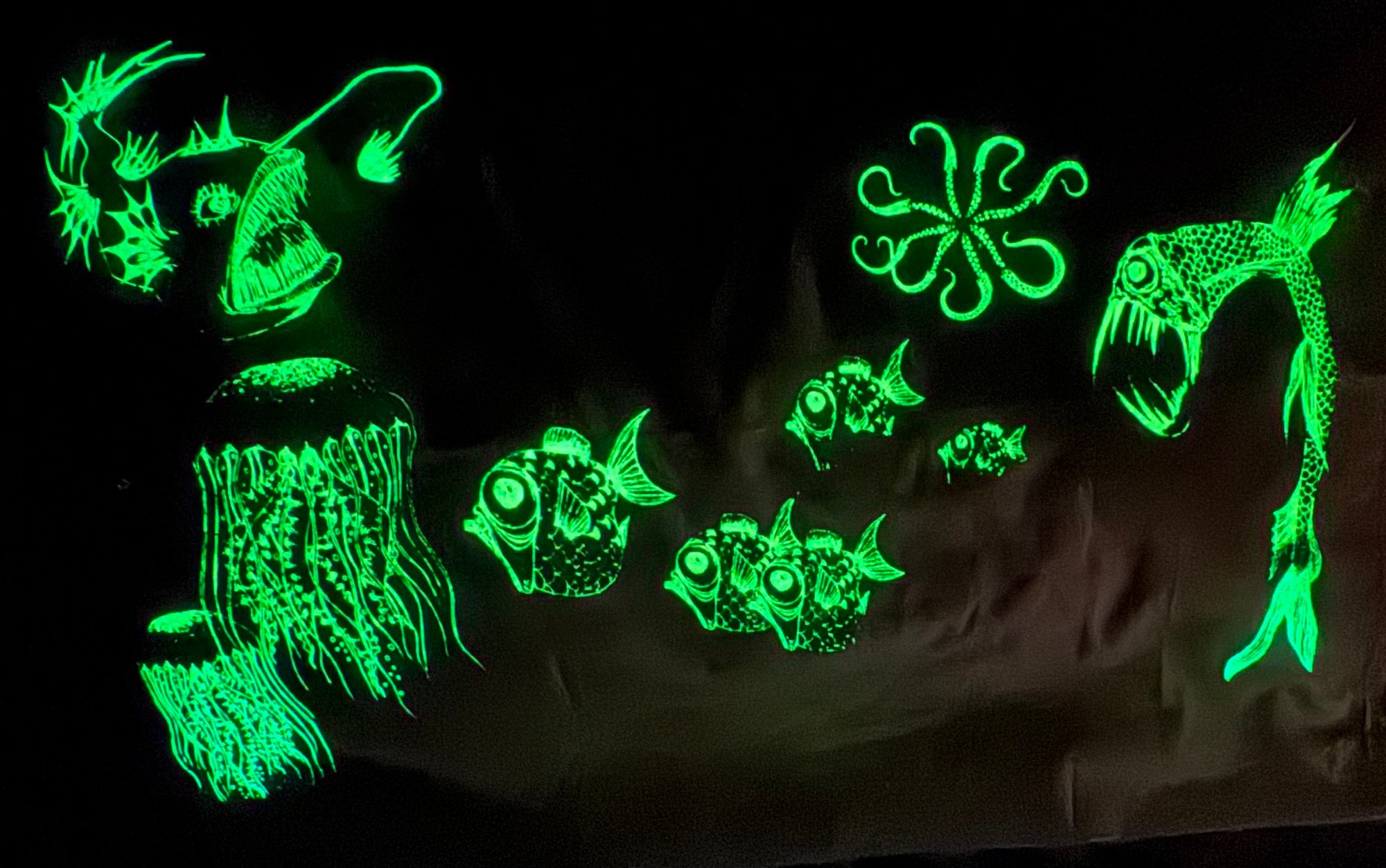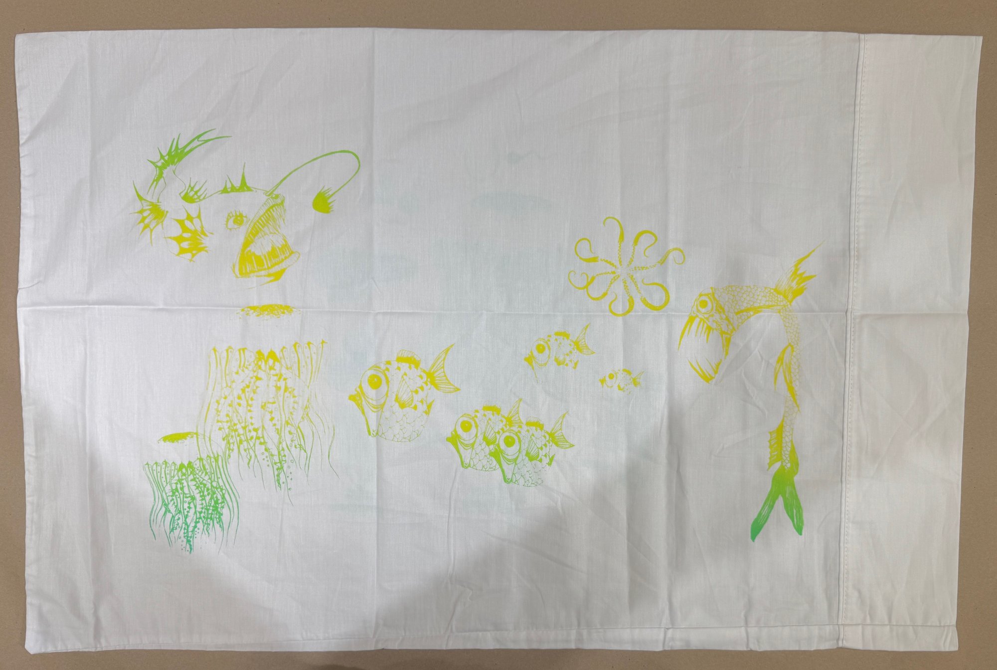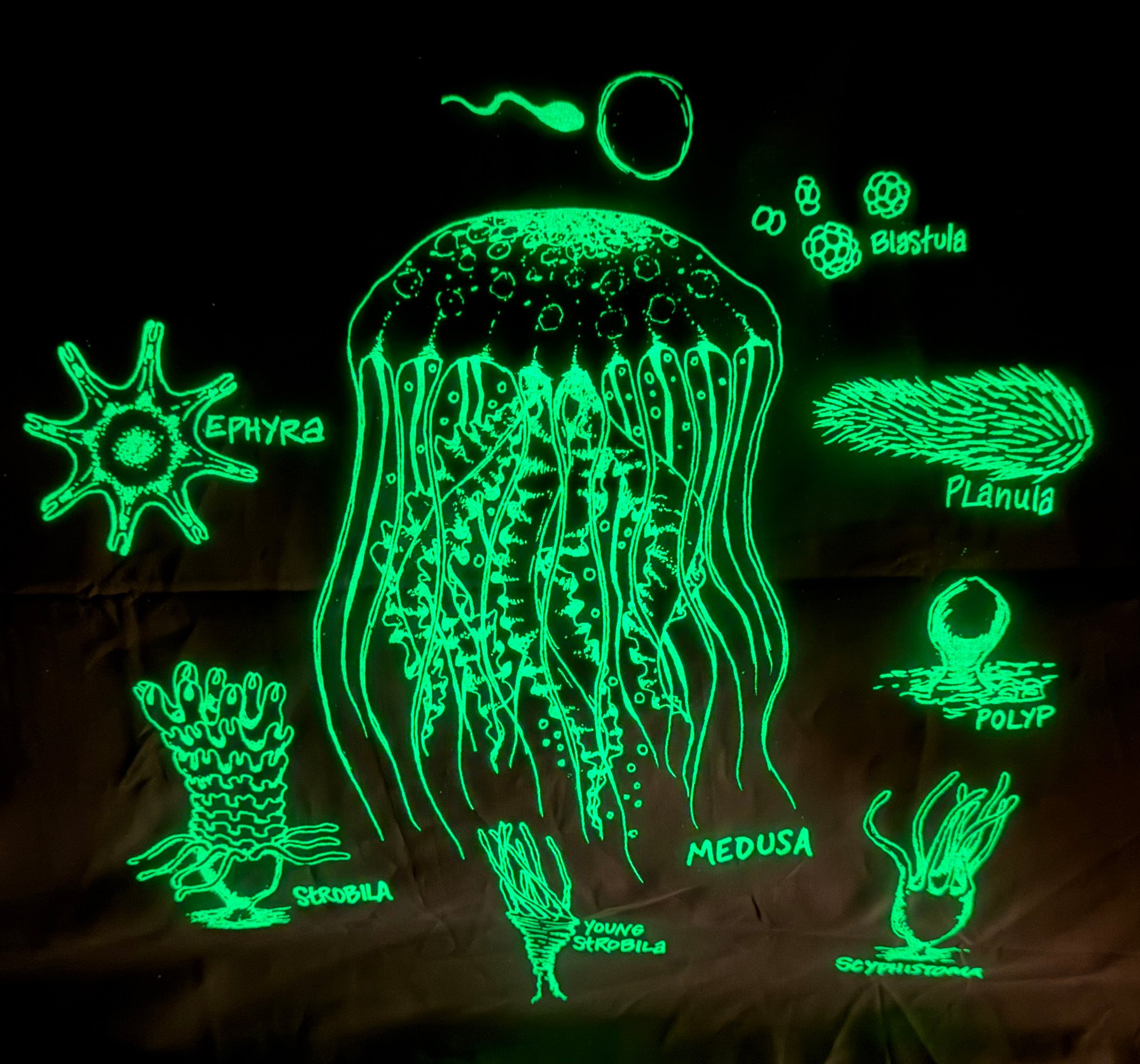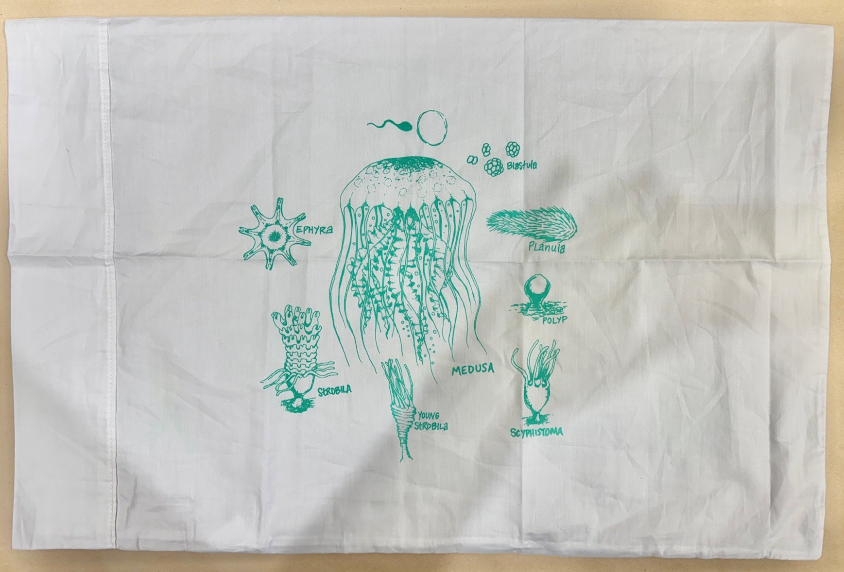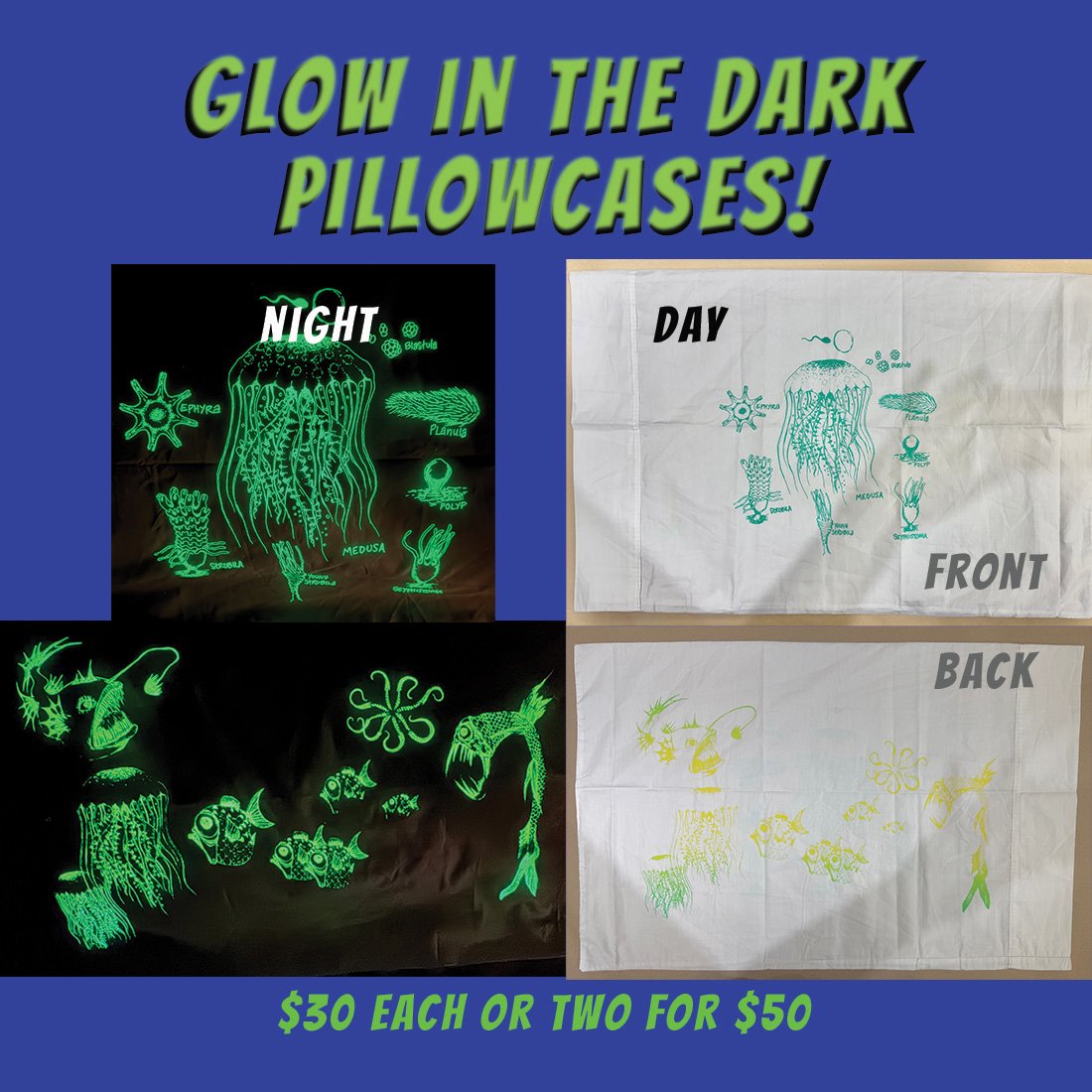 This pillowcase features an image of the jellyfish life cycle on one side and a variety of deep-sea creatures on the other. It is hand-printed, machine washable, and will glow for hours.